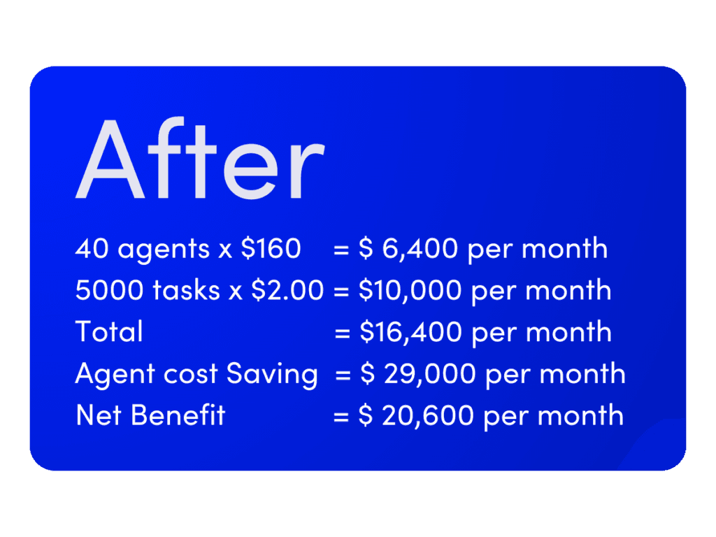 After training, OpenDialog Agents are able to execute many of the tasks being delivered by INS’s human agents. OpenDialog doesn’t charge a SaaS subscription fee for those Agents but instead for the work those agents deliver, let’s say at $2 per task. Within a month, those AI Agents are autonomously delivering 20% of the work being done by the human agents, equating to 5,000 tasks per month.
